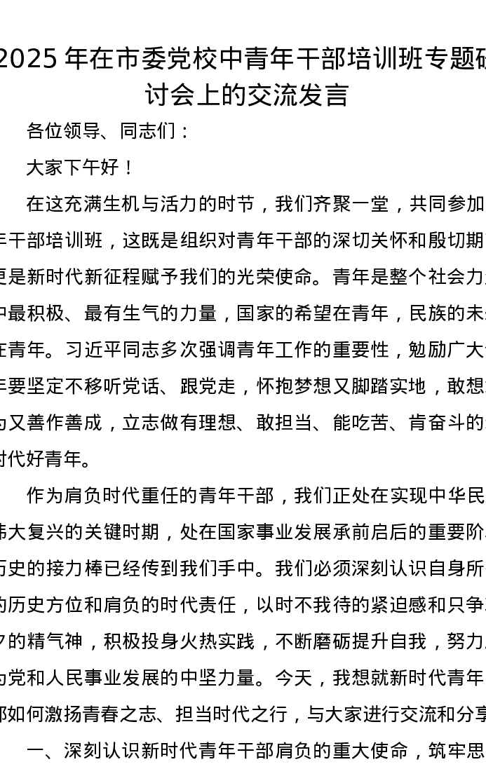 2025年在市委党校中青年干部培训班专题研讨会上的交流发言