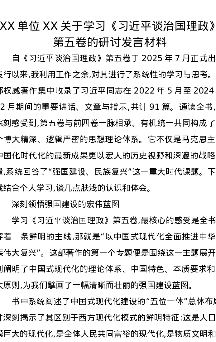 XX单位XX关于学习《习近平谈治国理政》第五卷的研讨发言材料