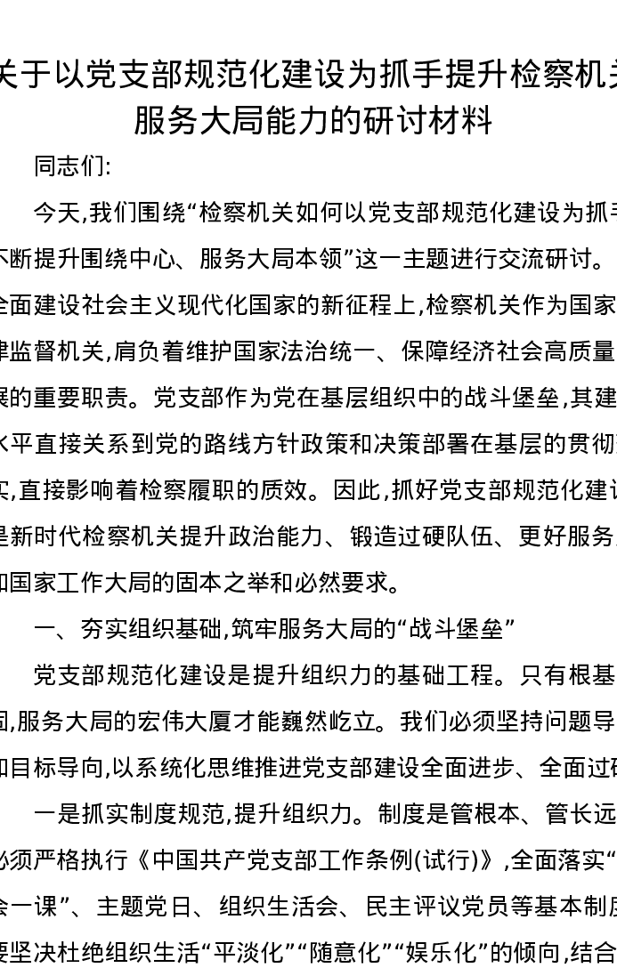 关于以党支部规范化建设为抓手提升检察机关服务大局能力的研讨发言材料
