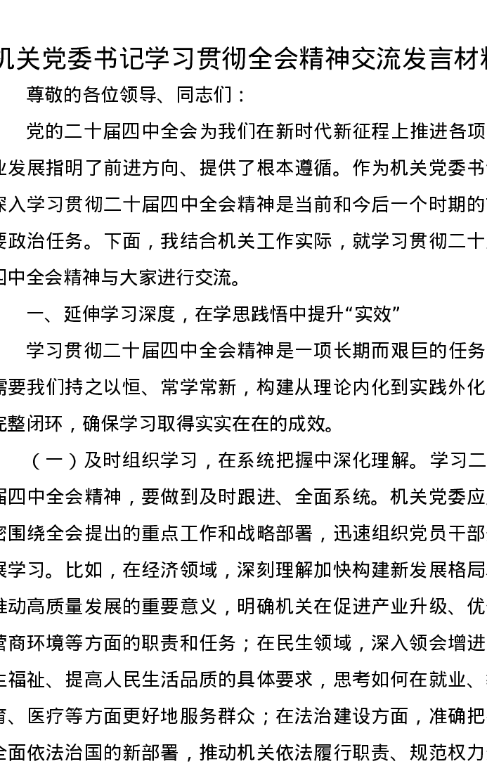 机关党委书记学习贯彻四中全会精神交流发言材料