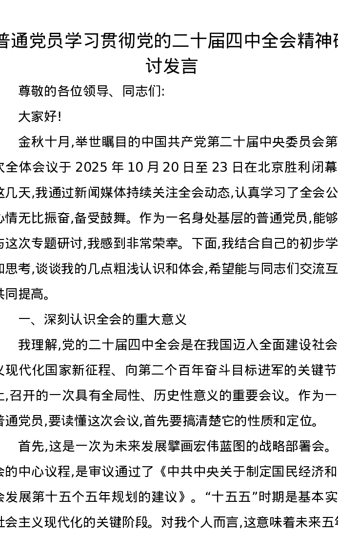普通党员学习贯彻党的二十届四中全会精神研讨发言