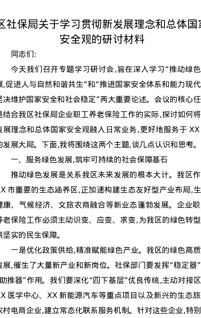 区社保局关于学习贯彻新发展理念和总体国家安全观的研讨发言材料