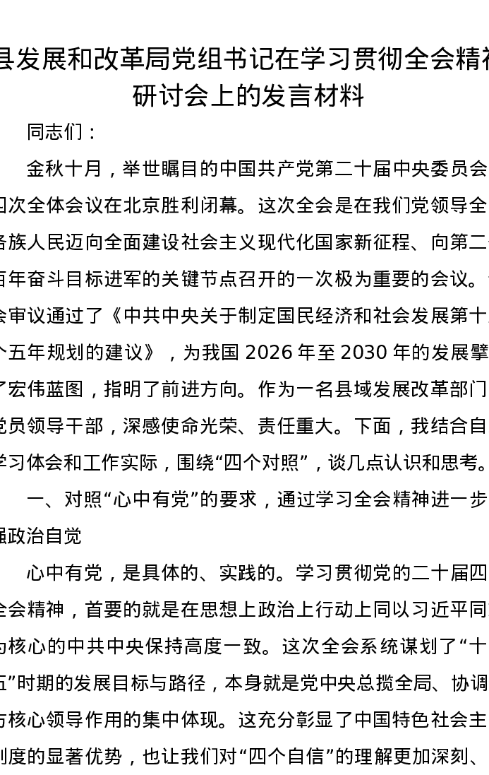 县发展和改革局党组书记在学习贯彻四中全会精神研讨会上的发言材料