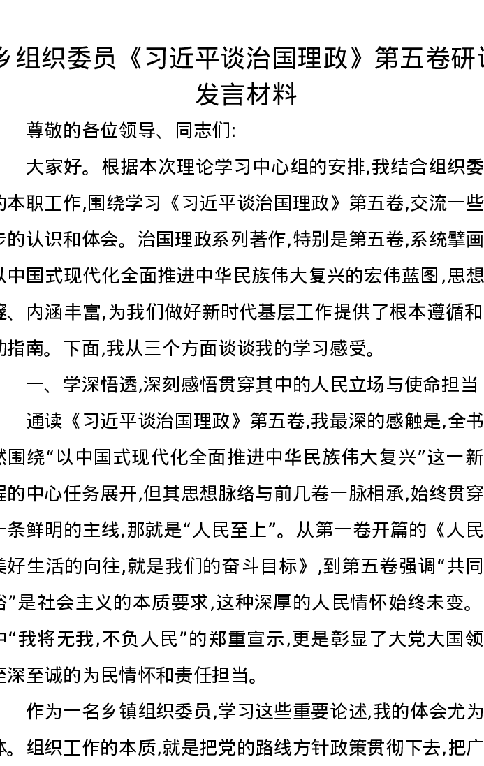 乡组织委员《习近平谈治国理政》第五卷研讨发言材料