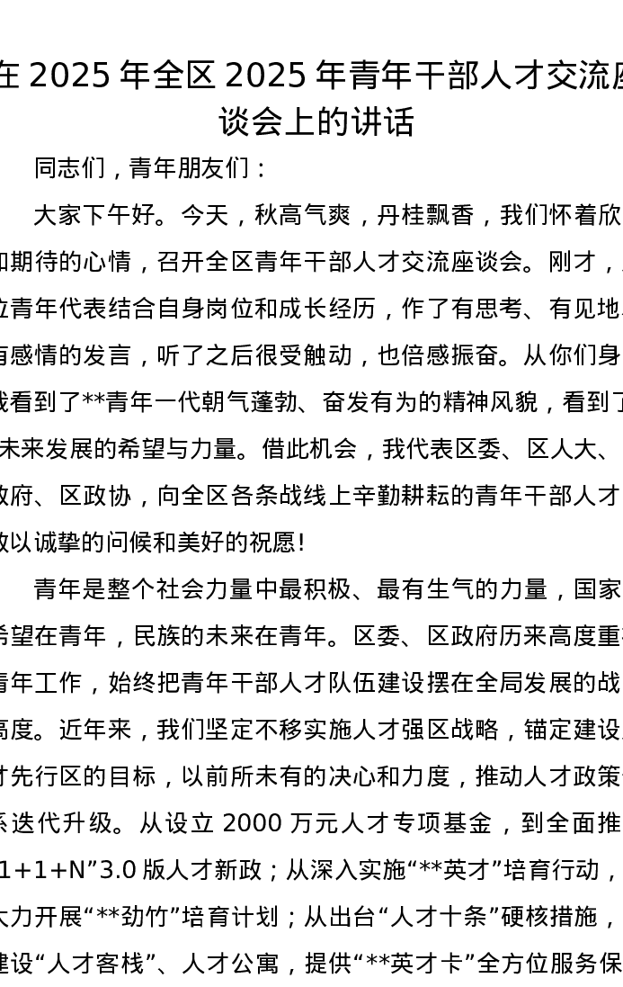 在2025年全区2025年青年干部人才交流座谈会上的讲话