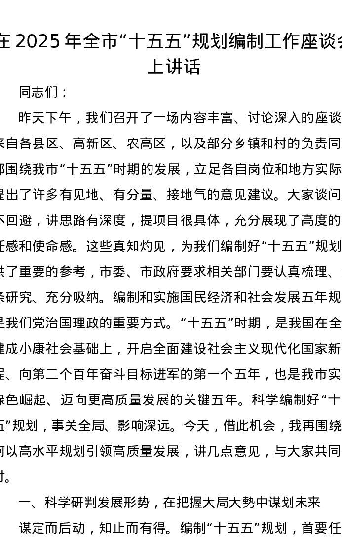 在2025年全市“十五五”规划编制工作座谈会上讲话