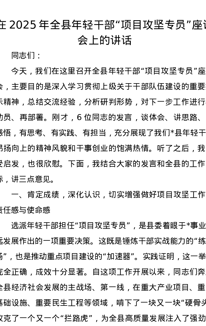 在2025年全县年轻干部“项目攻坚专员”座谈会上的讲话