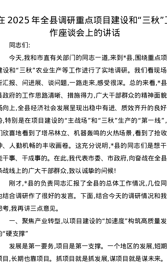 在2025年全县调研重点项目建设和“三秋”工作座谈会上的讲话