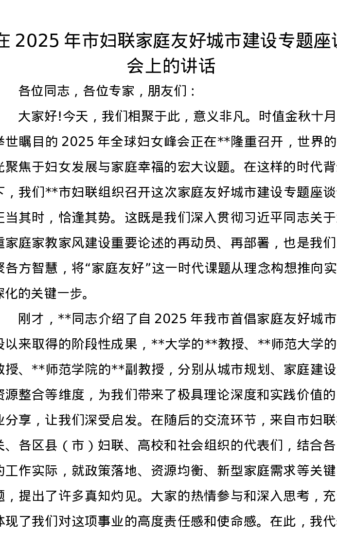 在2025年市妇联家庭友好城市建设专题座谈会上的讲话