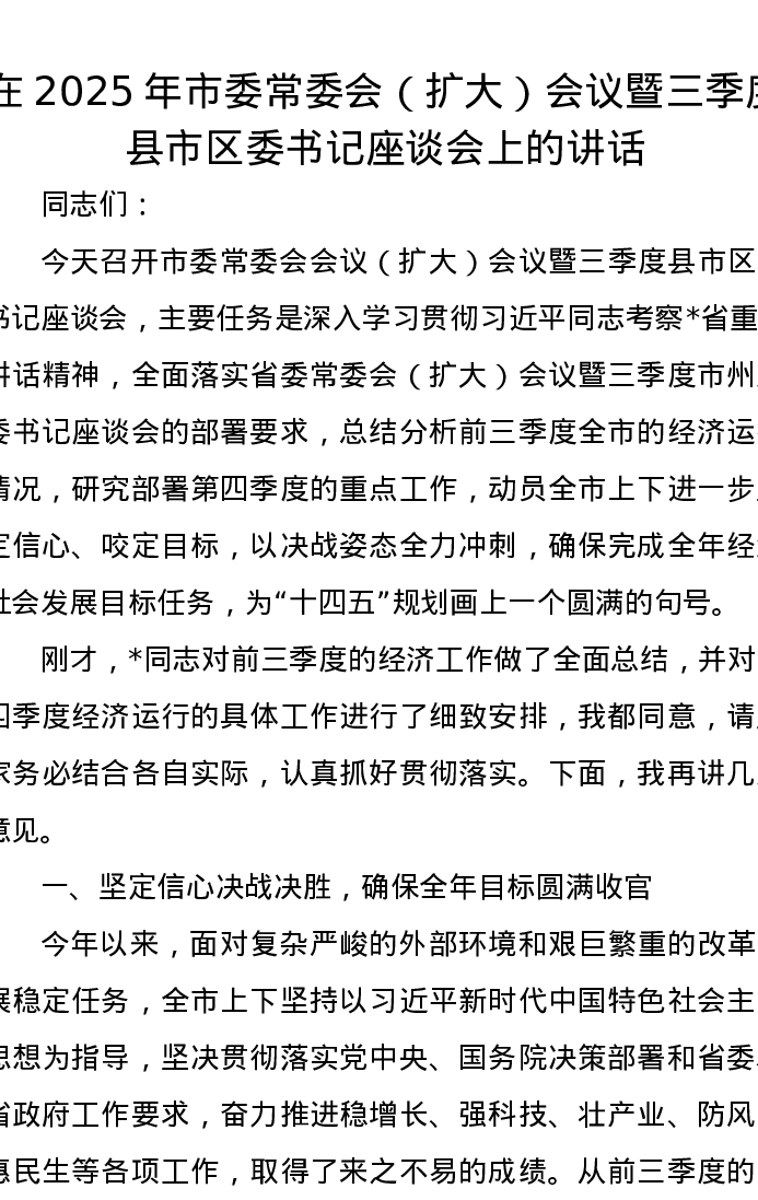 在2025年市委常委会(扩大)会议暨三季度县市区委书记座谈会上的讲话