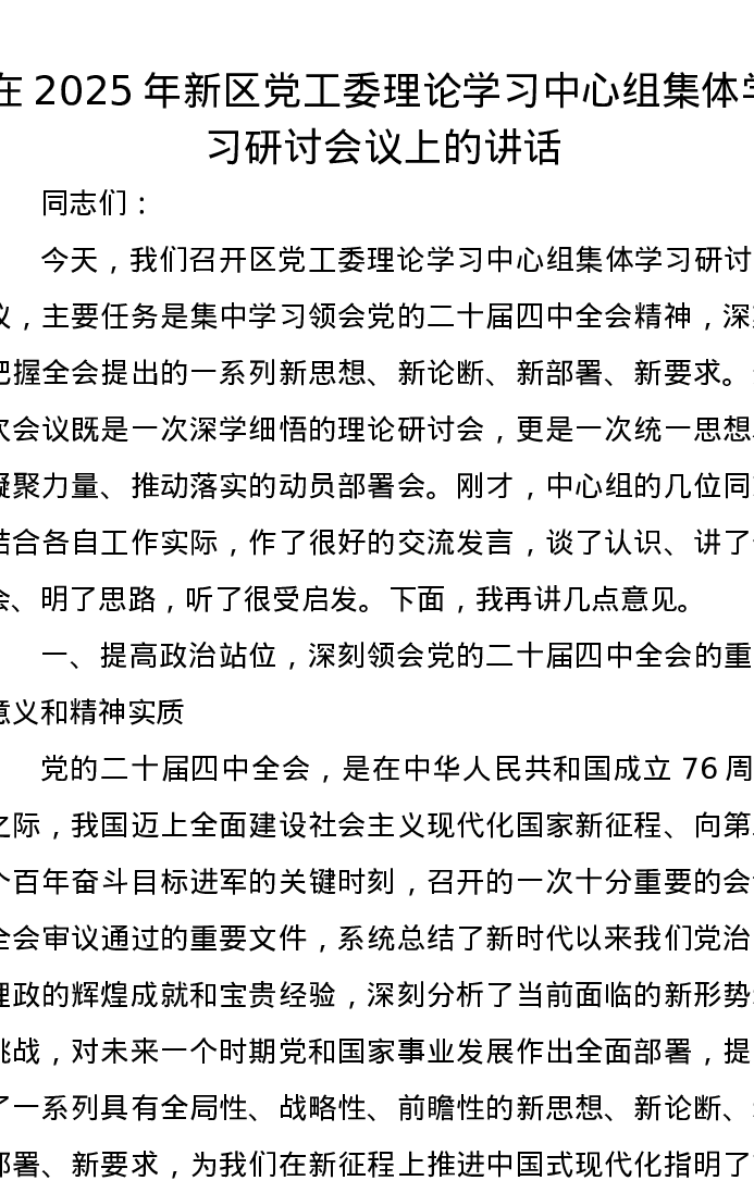 在2025年新区党工委理论学习中心组集体学习研讨会议上的讲话