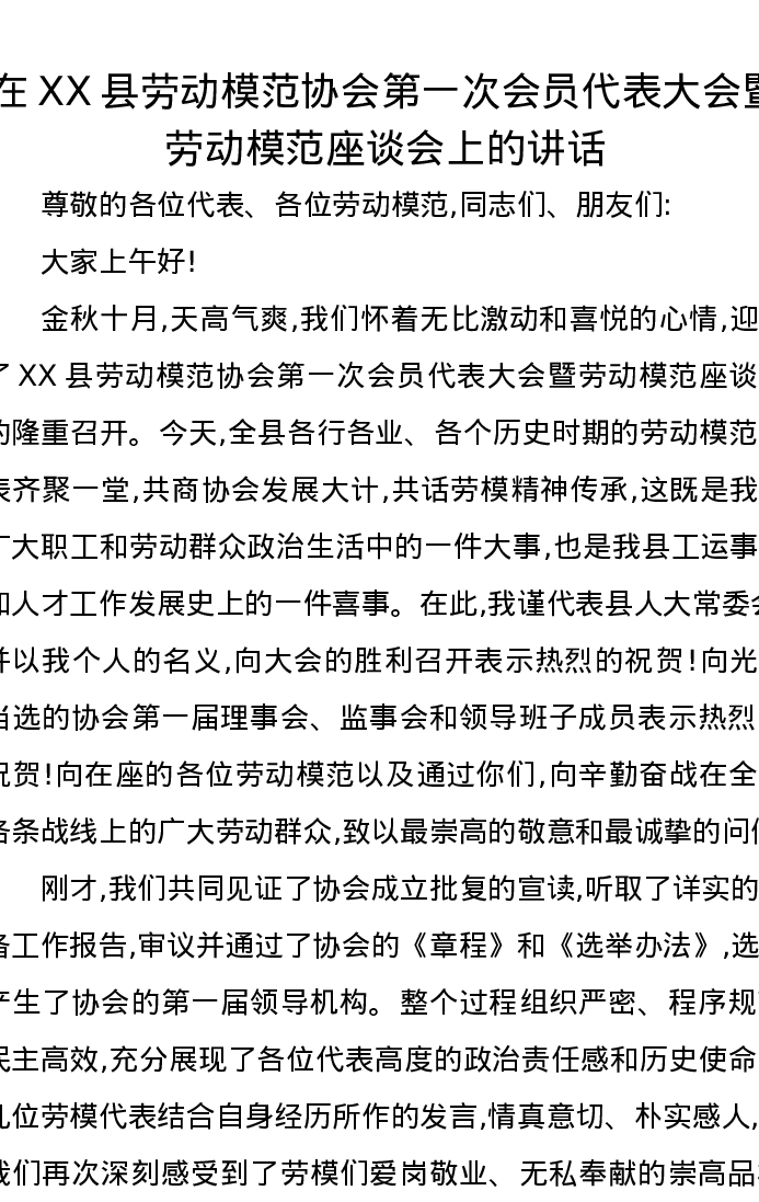 在XX县劳动模范协会第一次会员代表大会暨劳动模范座谈会上的讲话