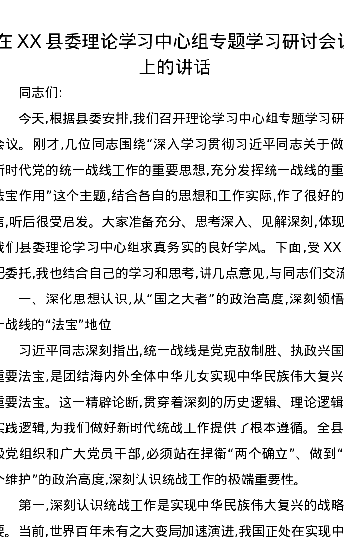 在XX县委理论学习中心组专题学习研讨会议上的讲话(统一战线)