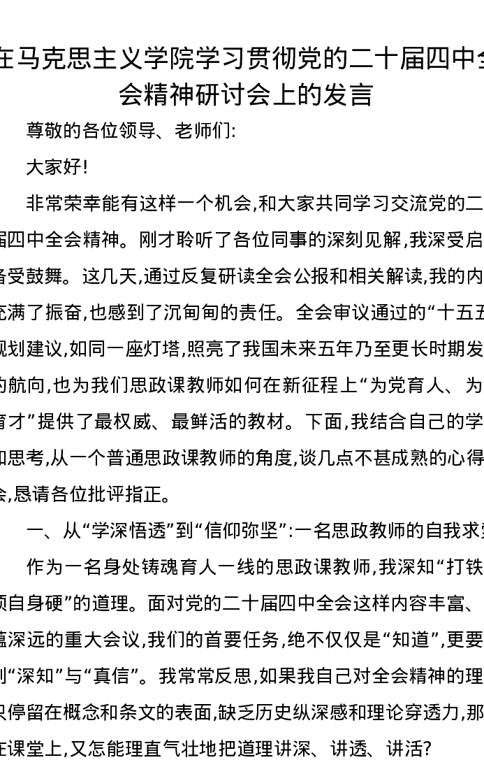 在马克思主义学院学习贯彻党的二十届四中全会精神研讨会上的发言