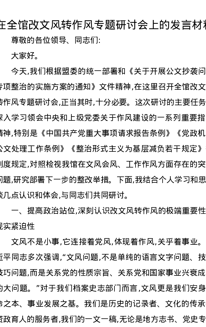 在全馆改文风转作风专题研讨会上的发言材料