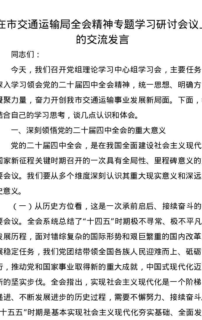 在市交通运输局二十届四中全会精神专题学习研讨会议上的交流发言