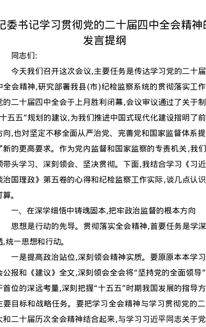 纪委书记学习贯彻党的二十届四中全会精神的发言提纲