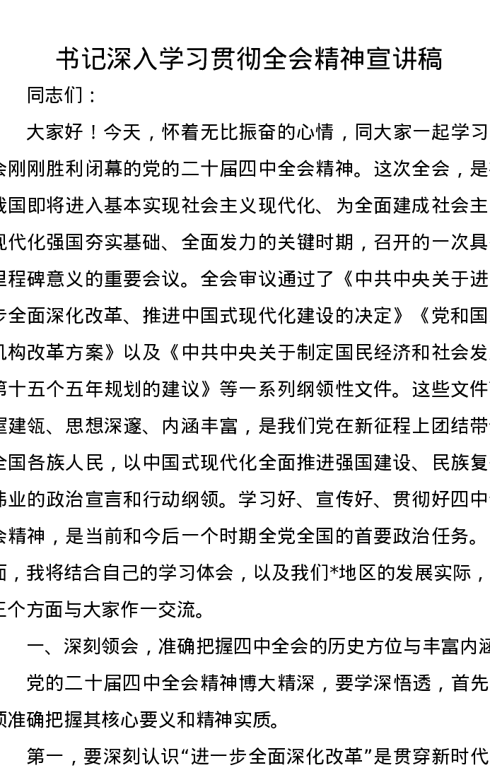 书记深入学习贯彻二十届四中全会精神宣讲稿