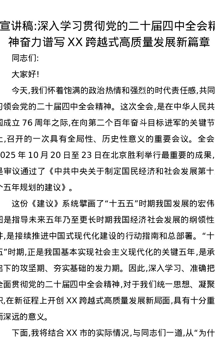 宣讲稿深入学习贯彻党的二十届四中全会精神奋力谱写XX跨越式高质量发展新篇章