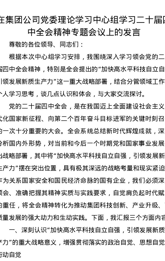 在集团公司党委理论学习中心组学习二十届四中全会精神专题会议上的发言