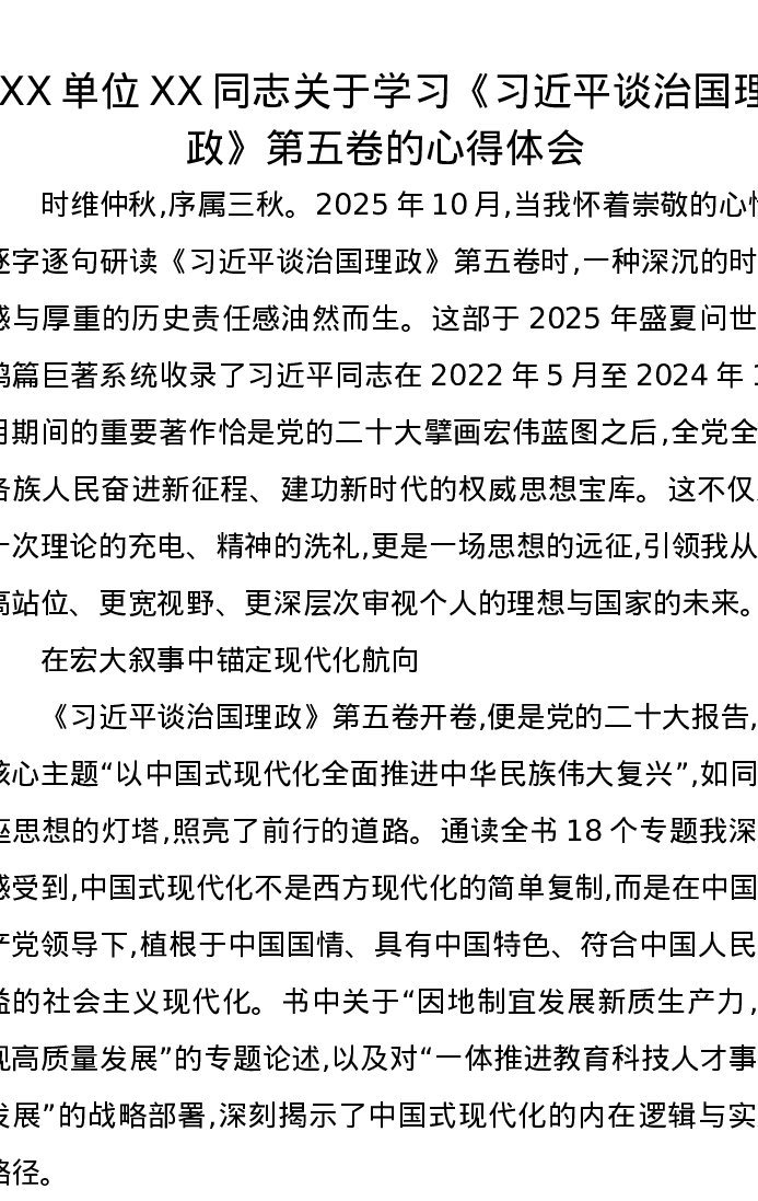 XX单位XX同志关于学习《习近平谈治国理政》第五卷的心得体会1