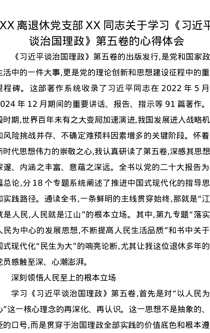 XX离退休党支部XX同志关于学习《习近平谈治国理政》第五卷的心得体会