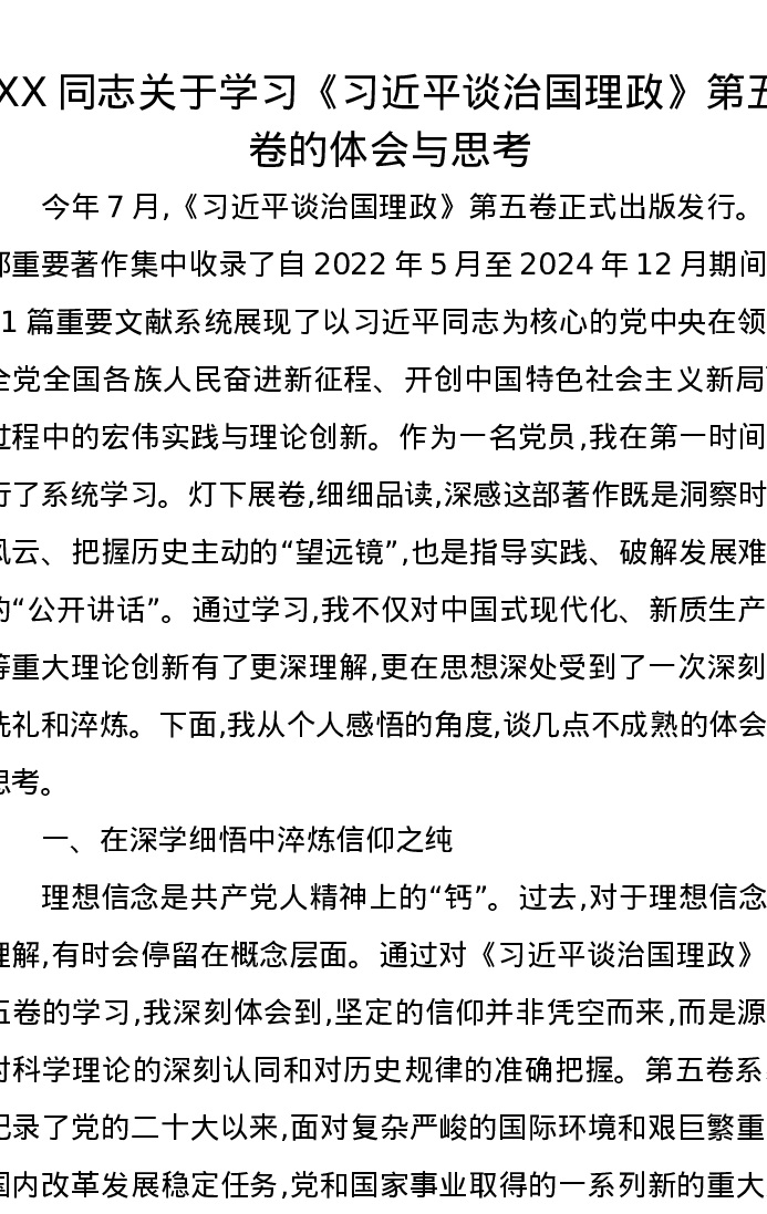 XX同志关于学习《习近平谈治国理政》第五卷的体会与思考心得
