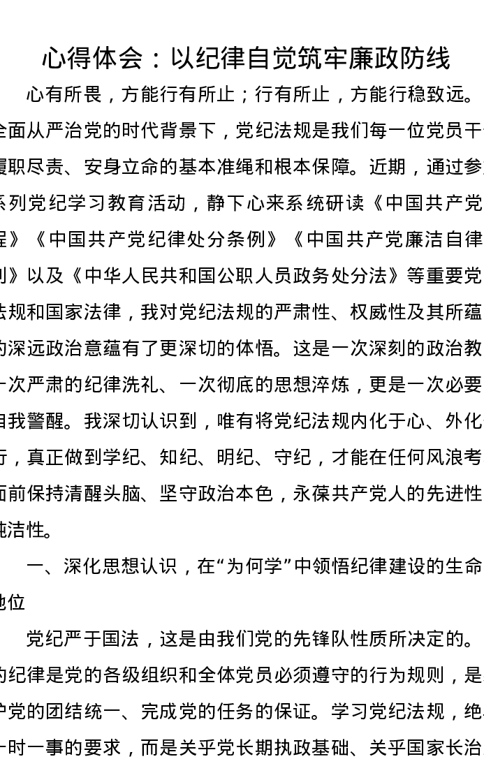 心得体会:以纪律自觉筑牢廉政防线