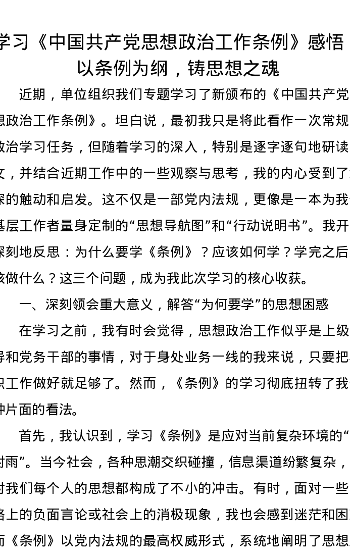 学习《中国共产党思想政治工作条例》感悟:以条例为纲,铸思想之魂
