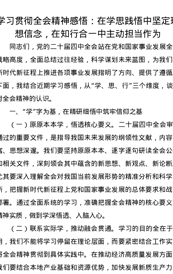 学习贯彻二十届四中全会精神感悟心得体会:在学思践悟中坚定理想信念,在知行合一中主动担当作为