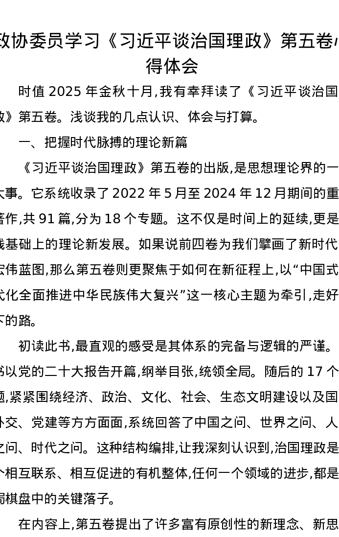 政协委员学习《习近平谈治国理政》第五卷心得体会