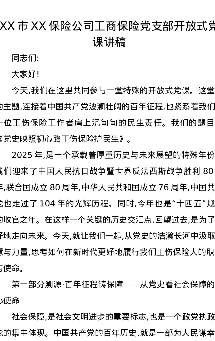 XX市XX保险公司工商保险党支部开放式党课讲稿