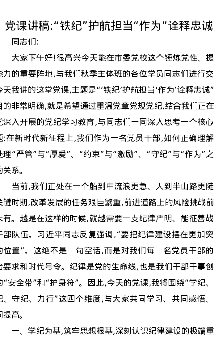 党课讲稿:“铁纪”护航担当“作为”诠释忠诚