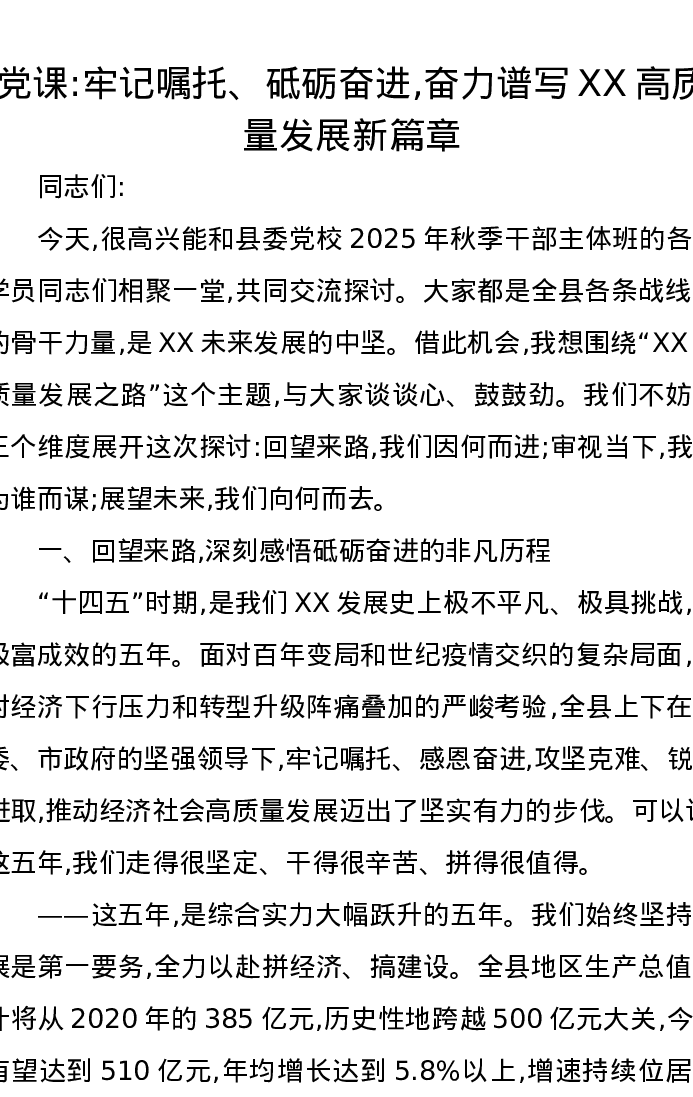 党课讲稿:牢记嘱托、砥砺奋进,奋力谱写XX高质量发展新篇章