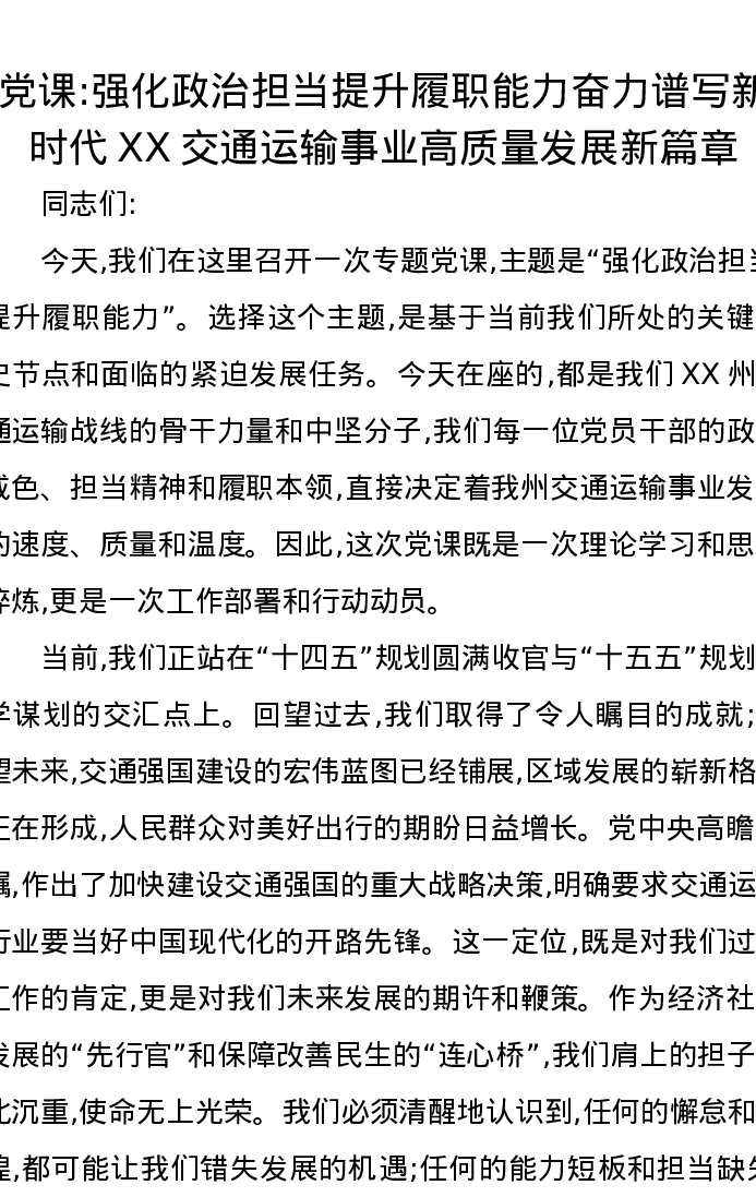 党课讲稿:强化政治担当提升履职能力奋力谱写新时代XX交通运输事业高质量发展新篇章