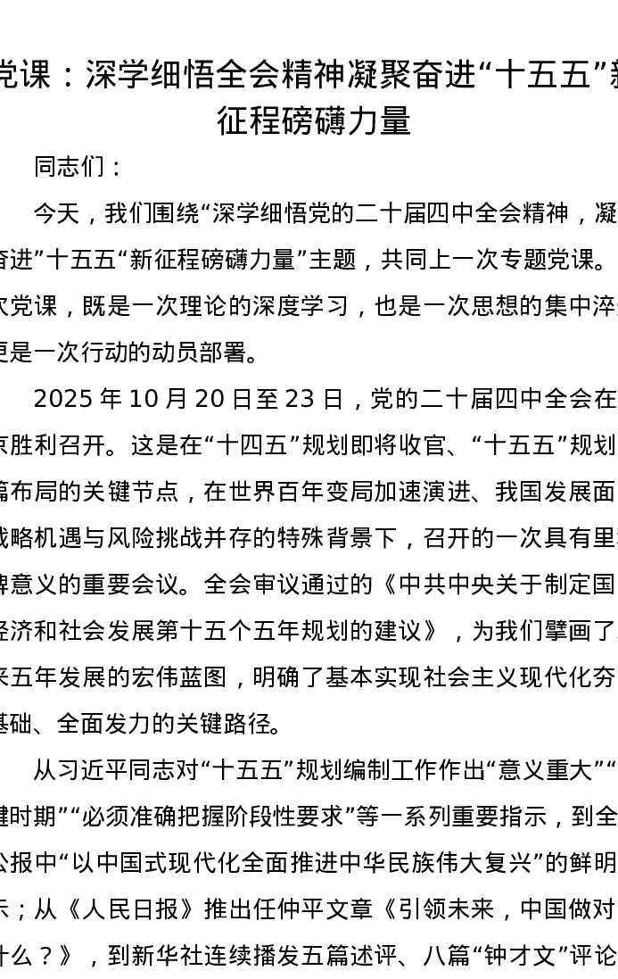 党课讲稿:深学细悟四中全会精神凝聚奋进“十五五”新征程磅礴力量