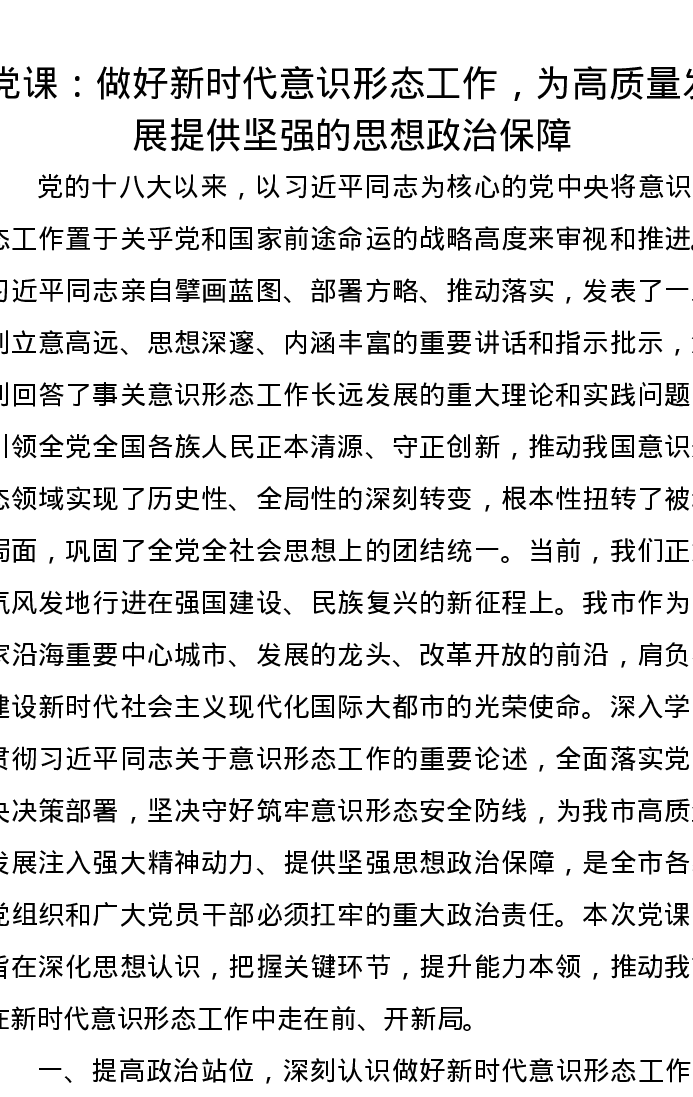 党课讲稿:做好新时代意识形态工作,为高质量发展提供坚强的思想政治保障