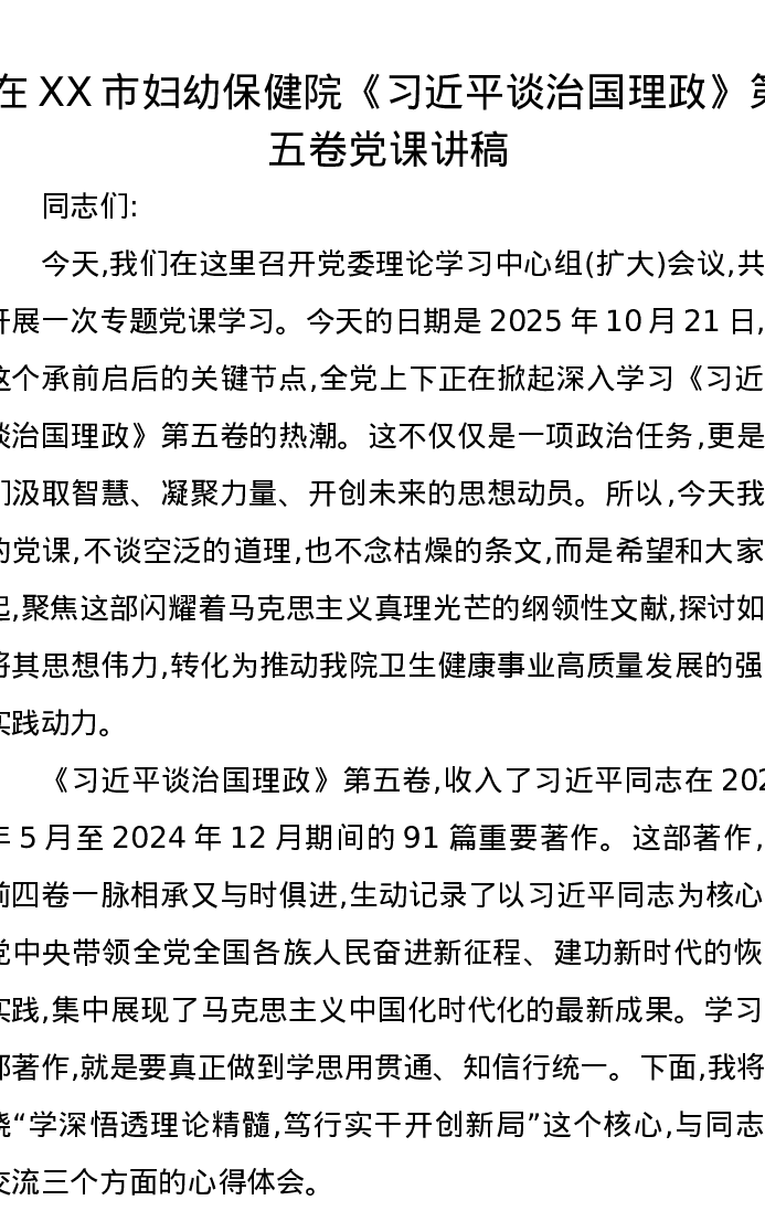 在XX市妇幼保健院《习近平谈治国理政》第五卷党课讲稿