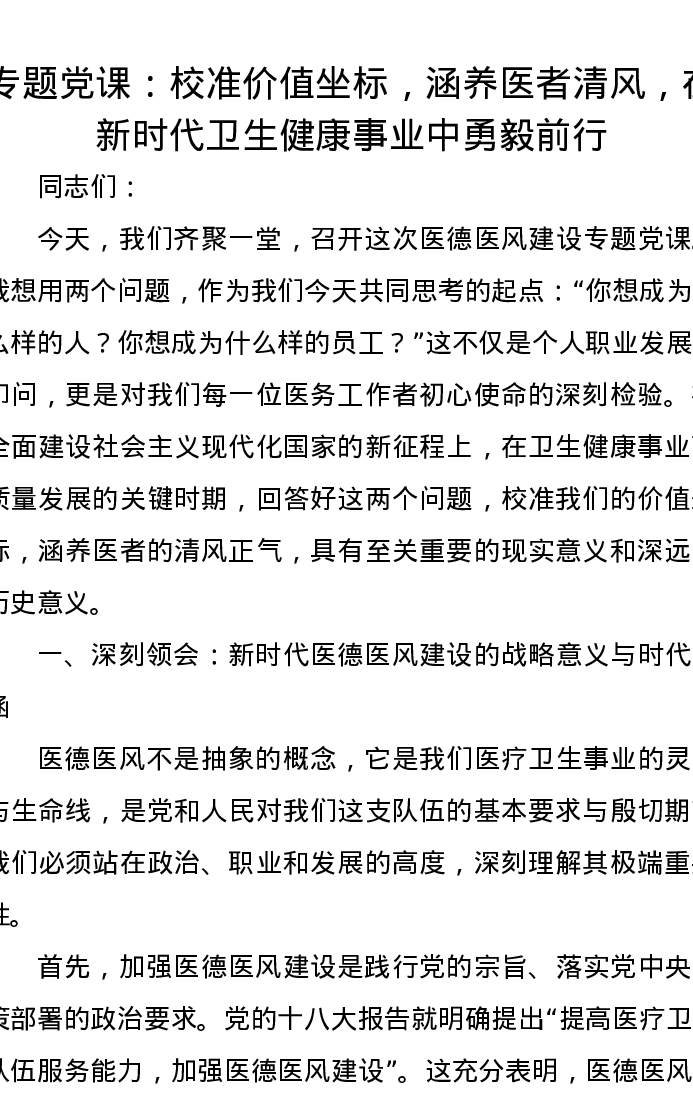 专题党课讲稿:校准价值坐标,涵养医者清风,在新时代卫生健康事业中勇毅前行
