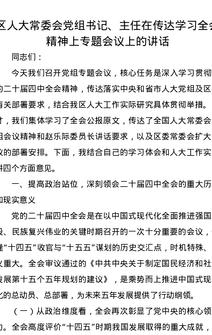 区人大常委会党组书记、主任在传达学习四中全会精神上专题会议上的讲话