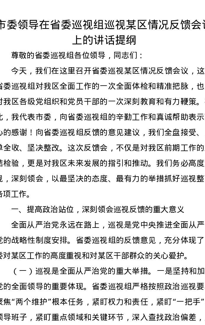 市委领导在省委巡视组巡视某区情况反馈会议上的讲话提纲