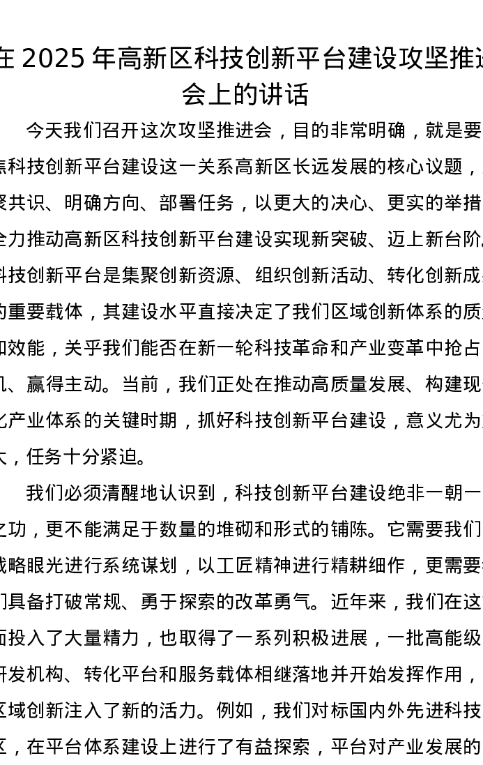 在 2025 年高新区科技创新平台建设攻坚推进会上的讲话