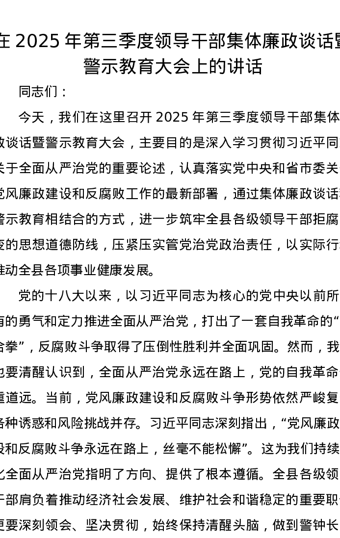 在2025年第三季度领导干部集体廉政谈话暨警示教育大会上的讲话