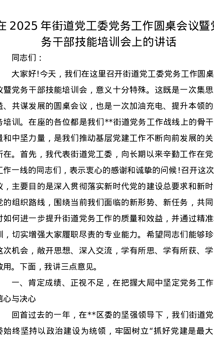 在2025年街道党工委党务工作圆桌会议暨党务干部技能培训会上的讲话