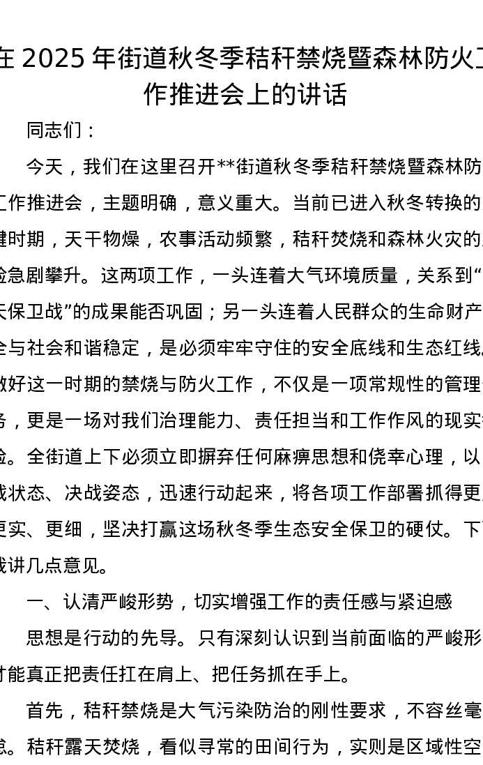 在2025年街道秋冬季秸秆禁烧暨森林防火工作推进会上的讲话
