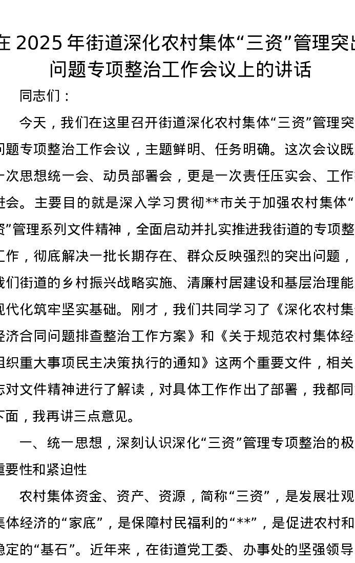 在2025年街道深化农村集体“三资”管理突出问题专项整治工作会议上的讲话