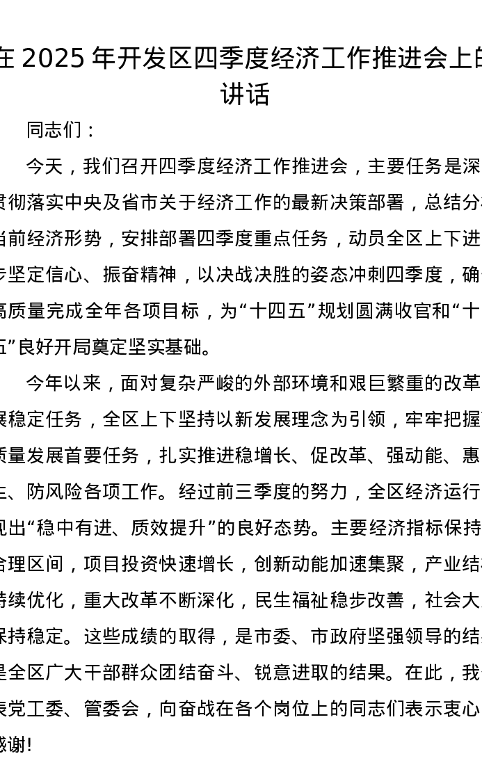 在2025年开发区四季度经济工作推进会上的讲话
