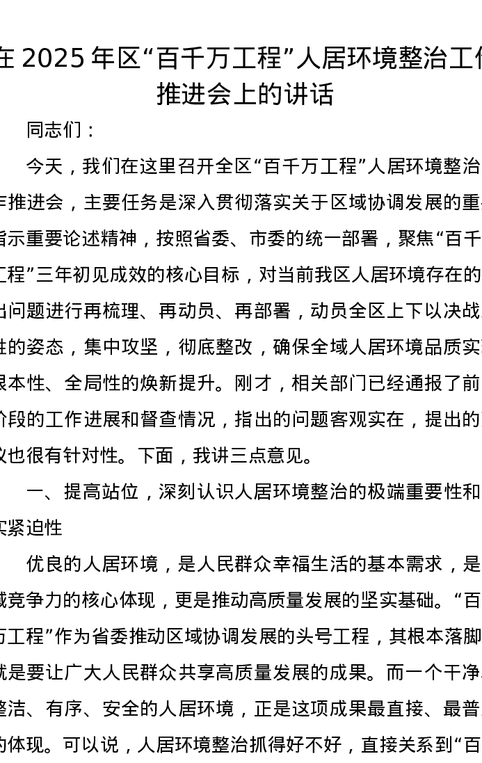 在2025年区“百千万工程”人居环境整治工作推进会上的讲话