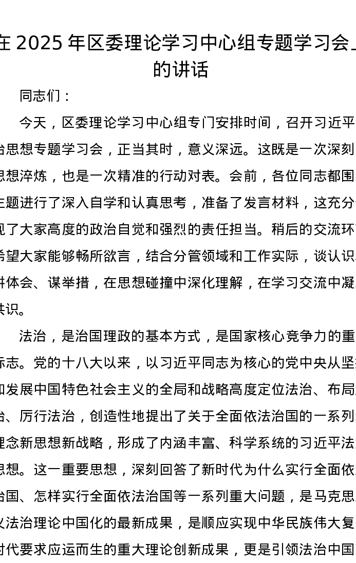 在2025年区委理论学习中心组专题学习会上的讲话(习近平法治思想)