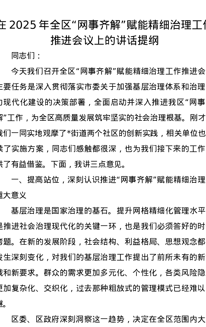 在2025年全区“网事齐解”赋能精细治理工作推进会议上的讲话提纲